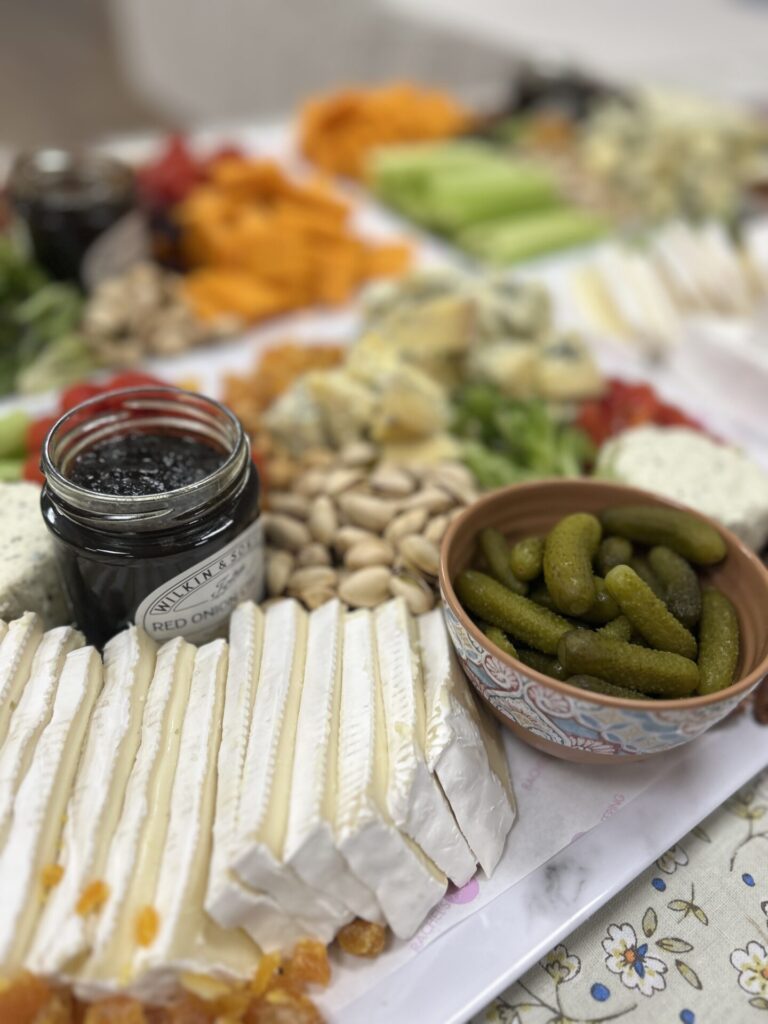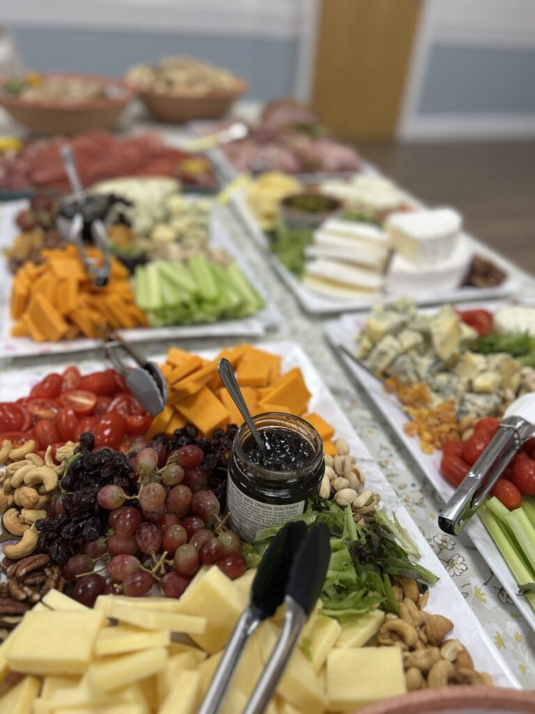 The guests enjoyed an abundant and beautifully presented fork buffet spread, starting with generous cheese and meat platters accompanied by crackers, fresh bread, and butter. A selection of quiches added to the variety, including Quiche Lorraine, salmon and asparagus, and onion and goat’s cheese. They also enjoyed pork pies, teriyaki sausages, and a colourful range of salads such as herb coleslaw, heritage tomato salad, creamy potato salad, and a vibrant green salad. For pudding, we served berry pavlovas, chocolate brownies, chocolate tart, French apple tarts, and apricot frangipane tarts, all elegantly displayed on our smart melamine platters.