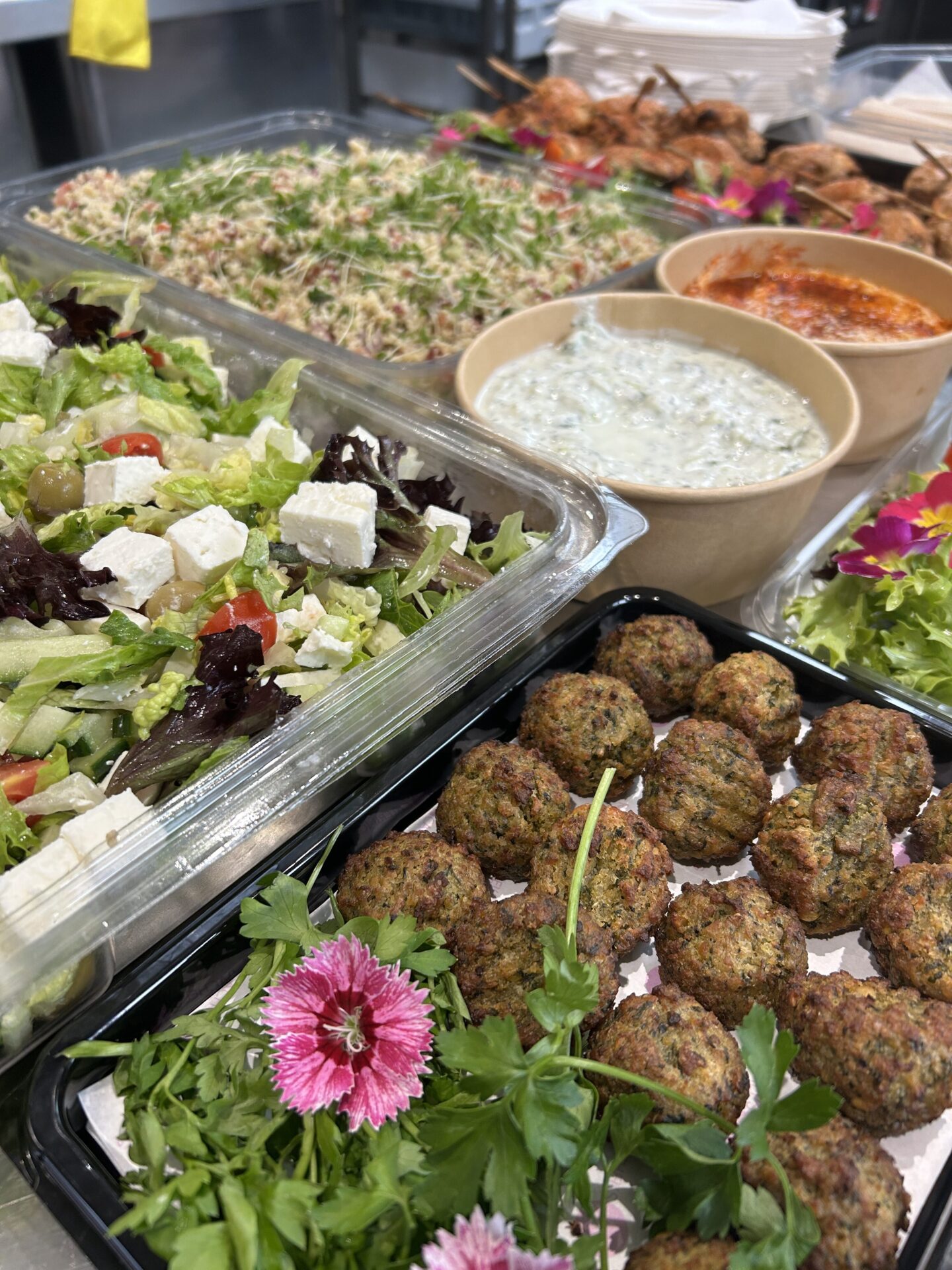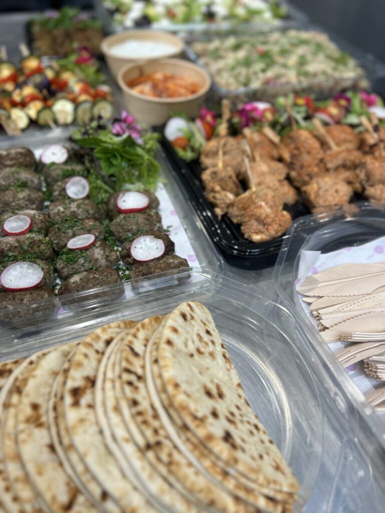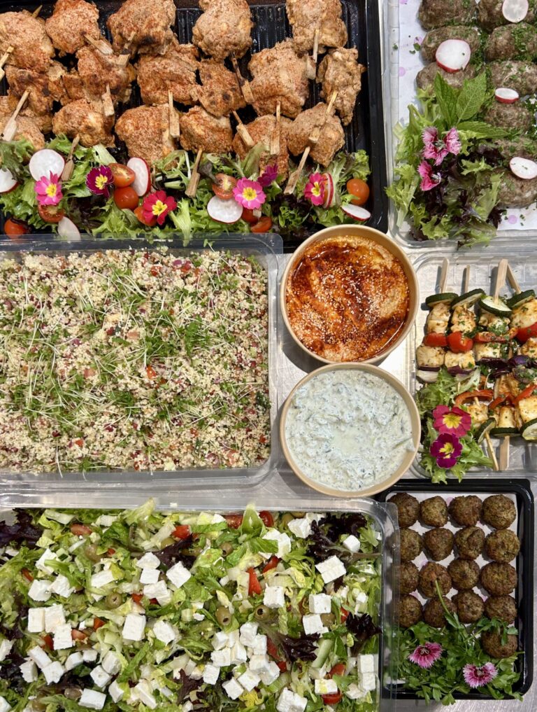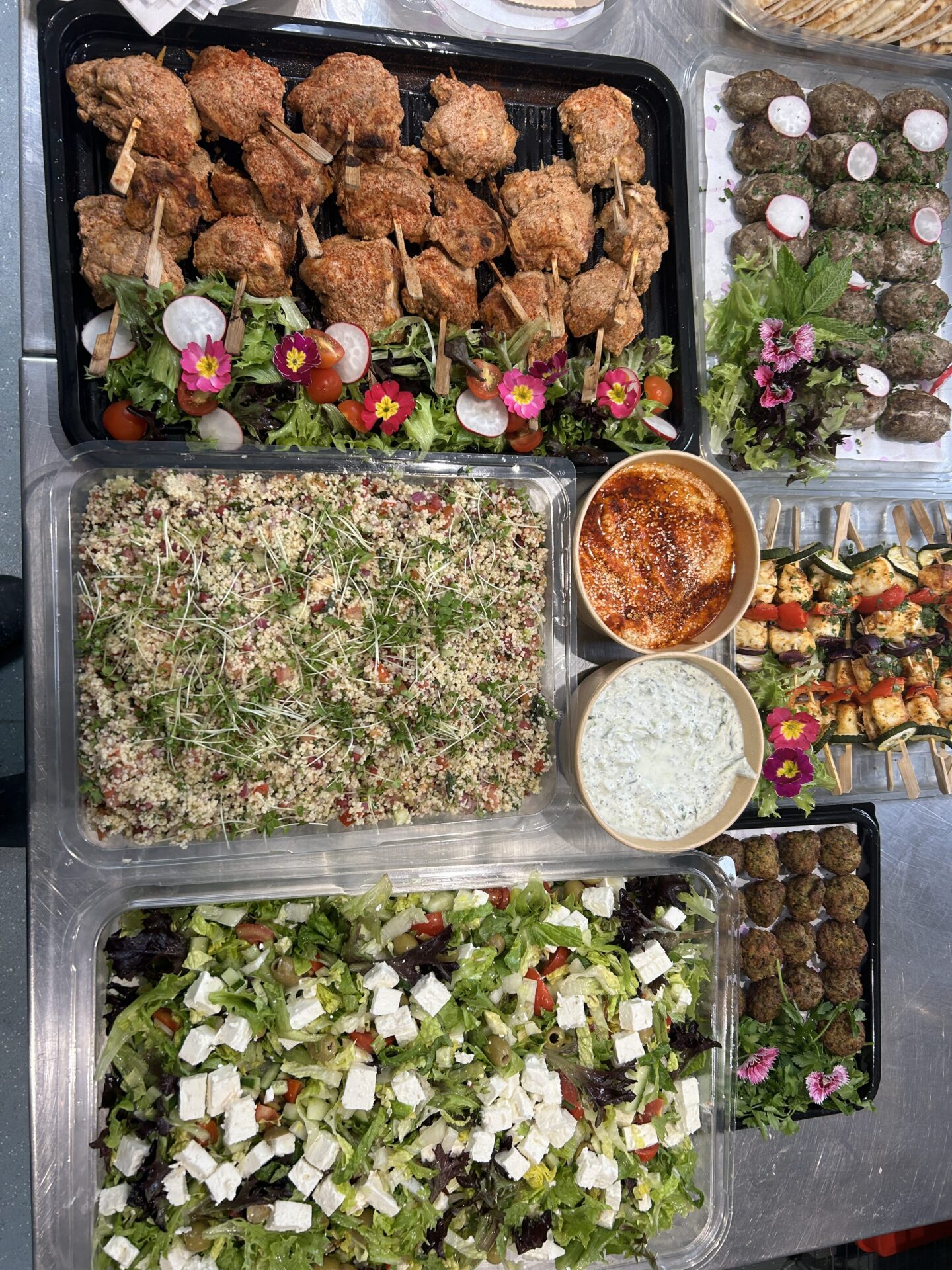 For this office lunch, the team ordered our Mediterranean Cold Fork Buffet for 20 people—a fresh and flavorful spread perfect for sharing. The menu included Turkish chicken kebabs, minted lamb koftas, roasted vegetable and halloumi skewers, creamy hummus, refreshing tzatziki, herby tabbouleh, Greek salad, chickpea falafels, soft flatbreads, and our signature house salad dressing. To finish on a sweet note, they selected two puddings: zesty lemon tarts and indulgent berry pavlovas, served with a bottle of cream. A vibrant and satisfying feast that brought a real taste of the Mediterranean to their lunch table!